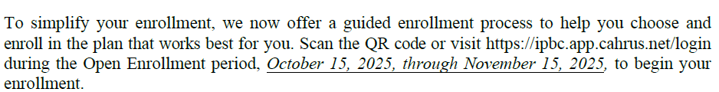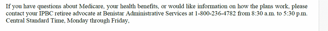 For questions regarding the Medicare continuation plans, you need to either go to the website listed in your letter or call the customer service number listed in your letter. Enrollment is through the Benistar program through its engagement with IPBC.
